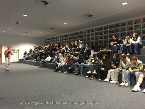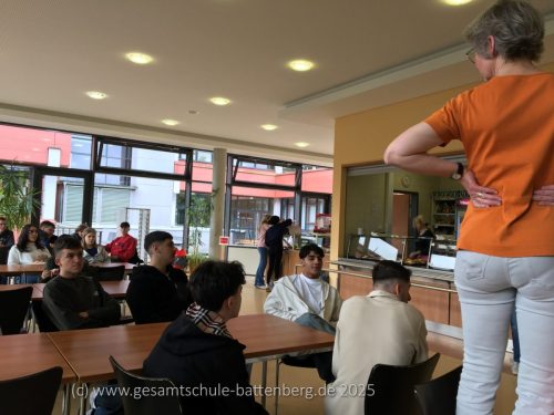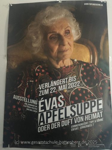 Im Mittelpunkt stand dabei eine Überlebende: Eva, die das Außenlager Münchmühle des KZs Buchenwald in Stadtallendorf überlebt hatte – nur etwa 45 Kilometer von unserer Schule entfernt. Ihre Lebensgeschichte ist bewegend und erschütternd zugleich. Besonders berührte viele ihr Rezept für eine einfache Apfelsuppe, das sie nach dem Krieg immer wieder zubereitete. Es wurde zu einem Symbol für das Überleben, für Wärme und Menschlichkeit inmitten des Unvorstellbaren.