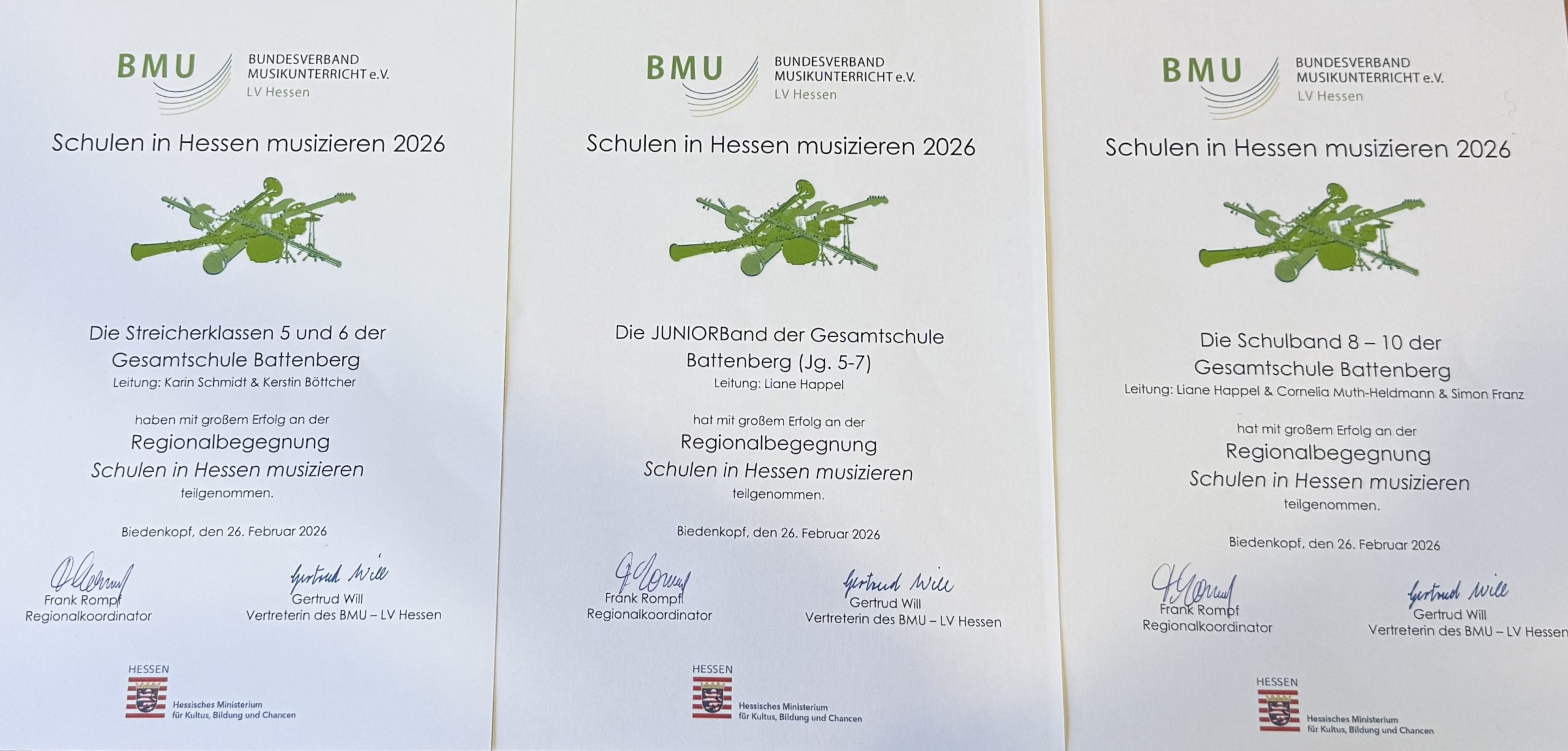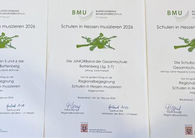 Auch in diesem Jahr nahm die Gesamtschule Battenberg an dem landesweiten Musikprojekt „Schulen in Hessen musizieren“ teil. Dafür fuhren drei unserer Ensembles nach Biedenkopf, um gemeinsam mit anderen Schulen einen musikalischen Tag zu gestalten: